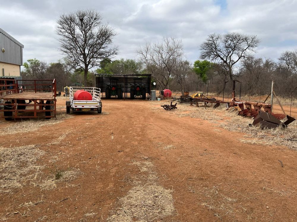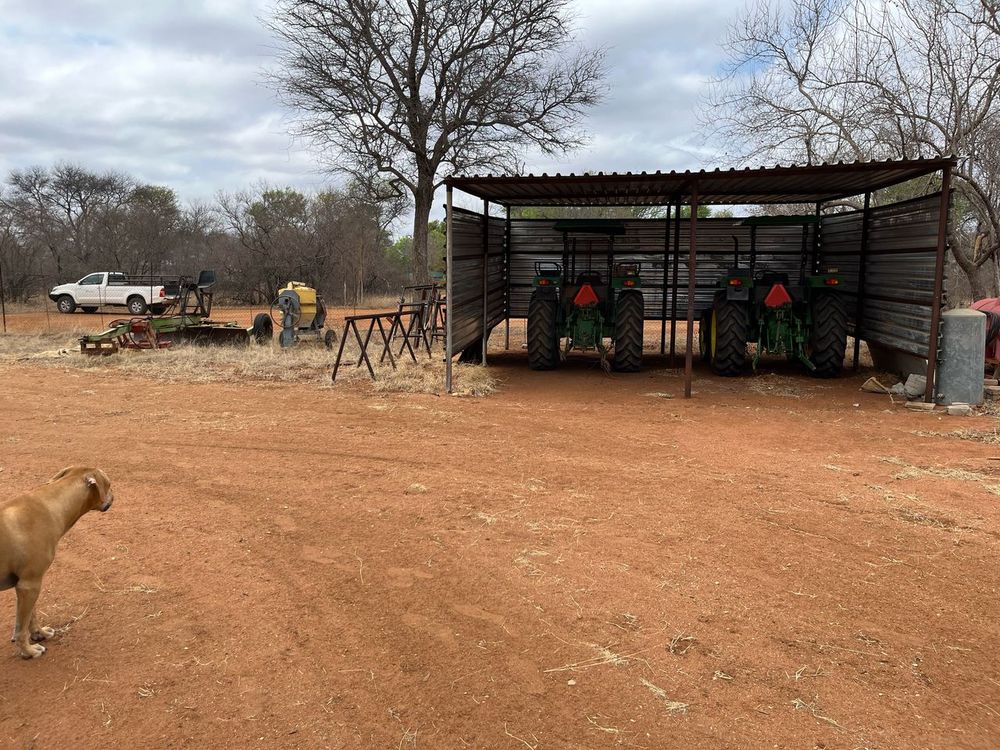 Included in the sale is a Toyota Hilux D4D single cab 4x4 equipped for game viewing. A John Deere Tractor 5403 complements the array of farm implements like grass cutters, rippers, and disk ploughs.