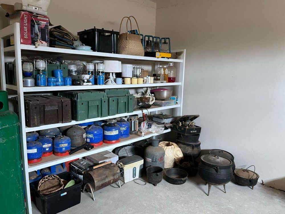 The large two-door shed comprises three lockable rooms stocked with camping gear, spares, and building materials. Two mezzanine levels house maintenance equipment. The workshop is fully equipped with three-phase plugs for a large air compressor and various electrical tools necessary for farm and house maintenance. A toilet and freestanding basin add convenience.