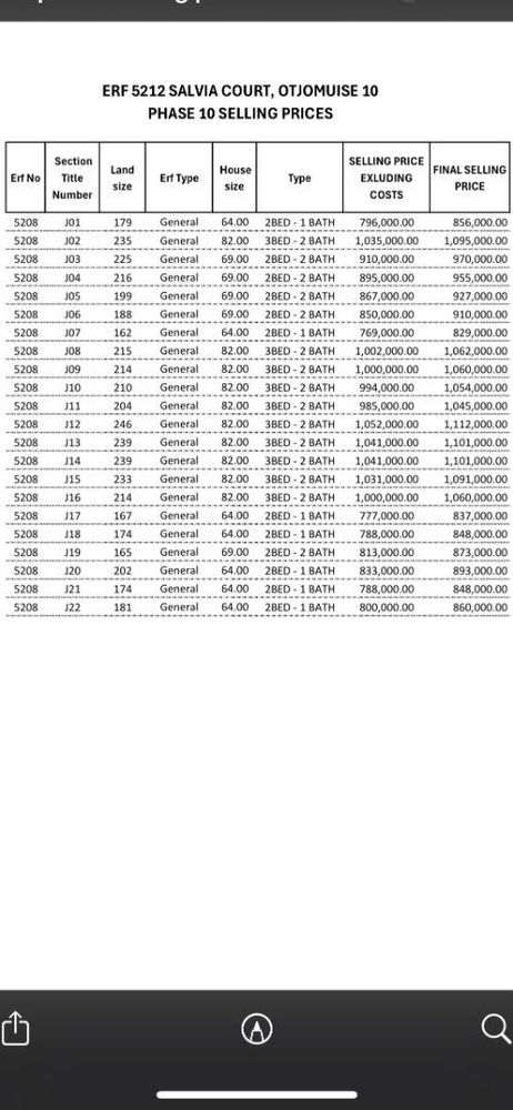- Final Selling Prices: N$829,000 – N$1,112,000 (including costs)